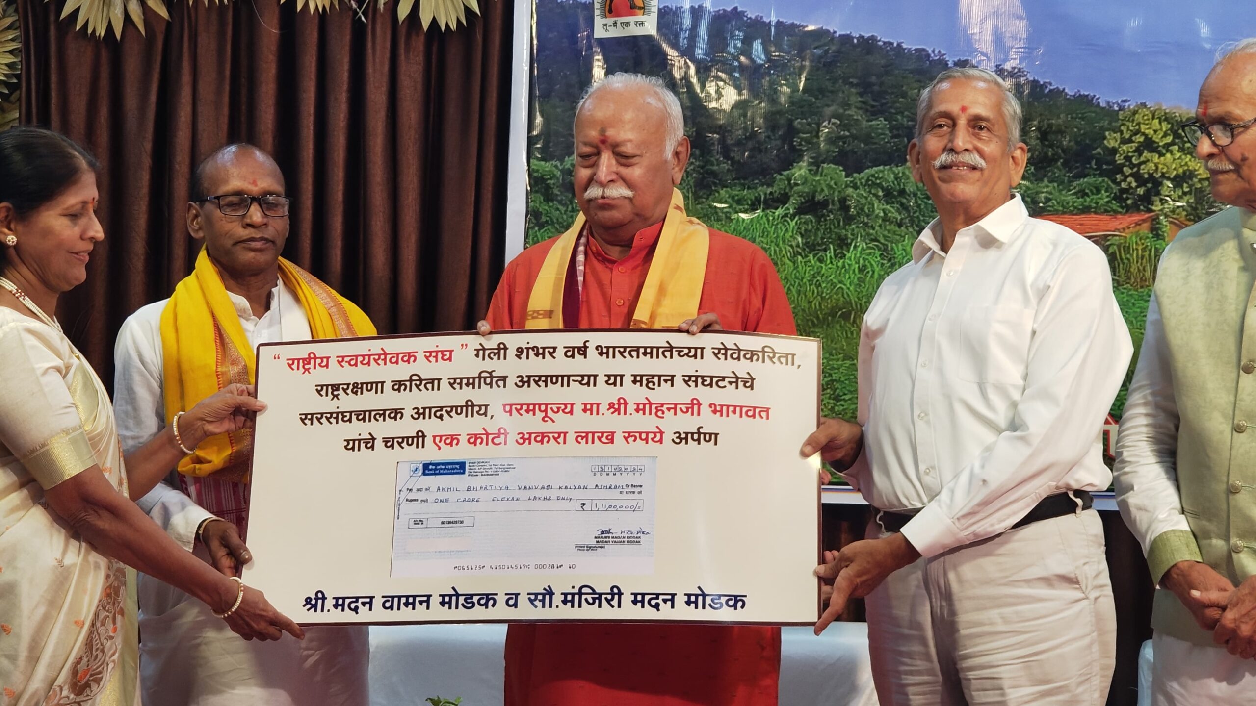 रत्नागिरी जिल्ह्यातील देवरुखनिवासी श्री मदन वामनराव मोडक व सौ. मंजिरी मदन मोडक यांनी नागपूर येथे वनवासी कल्याण आश्रमासाठी एक कोटी अकरा लाख रुपये देणगीचा धनादेश राष्ट्रीय स्वयंसेवक संघाचे सरसंघचालक मोहनराव भागवत यांच्या हाती सुपूर्द केला. कल्याण आश्रमाचे अध्यक्ष माननीय सत्येंद्र सिंह याप्रसंगी उपस्थित होते. श्री. मोडक यांच्या दोन्ही कन्या सपरिवार कार्यक्रमात उपस्थित होत्या.